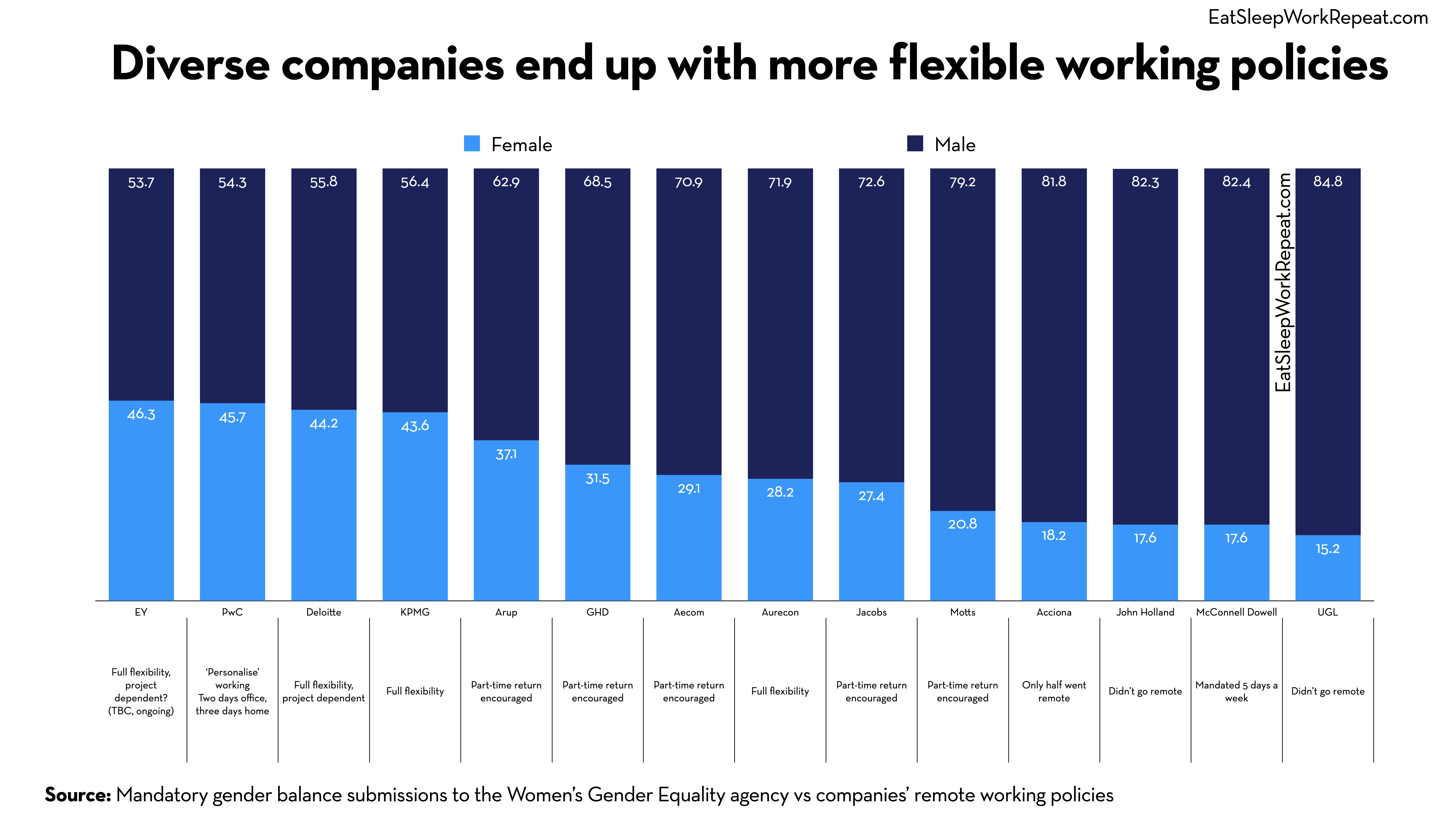 I’ll explain how we reached that conclusion. Firstly, we took a look at different firms gender split and then gathered their new flexible working policies. Click here to see in more detail.
